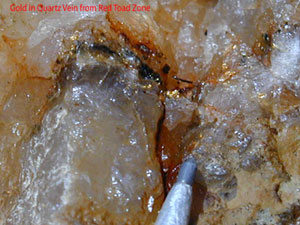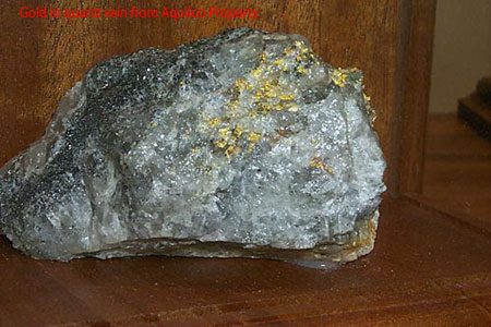 In September 2004, Golden Tag conducted a first phase exploration program of diamond drilling and mechanical surface stripping on the Red Toad Zone approximately 500 meters east of the historical. This was in response to the favourable results obtained in the initial evaluation. Drill results from this program consisting of 11 BTW core holes totaling 954 meters, 9 of which were drilled on the Red Toad Zone, indicated the Red Toad Zone was continuous over a minimum strike length of approximately 100 meters and had been confirmed from the surface to a depth of 36 meters. Hole AQU-04-03 intersected 4.33 meters of mineralization at an average grade of 10.03 g/t Au. The mechanical surface stripping program of five trenches conducted in conjunction with the drilling program traced the mineralization of the Red Toad Zone over a 250 meter strike length. A grab sample collected to the west returned 838 g/t Au. (refer to Golden Tag�s news release of November 9, 2004 for a synopsis of significant results) |