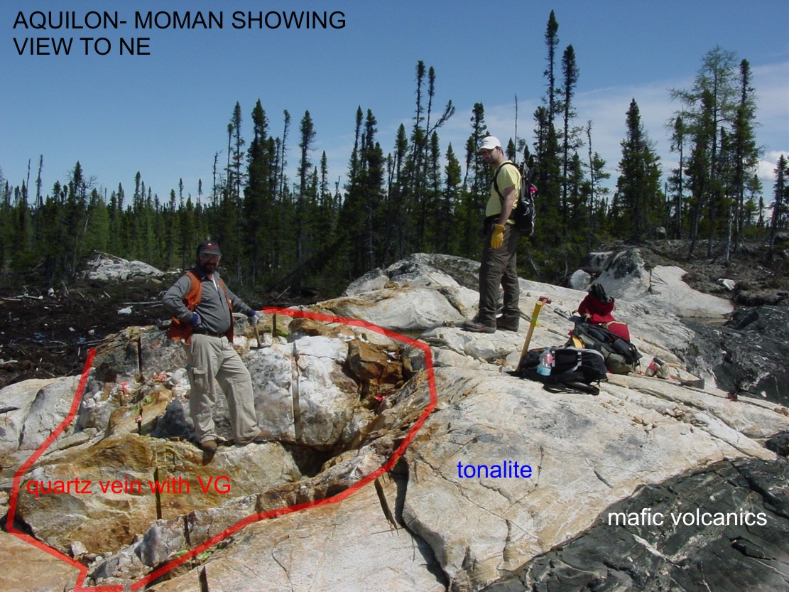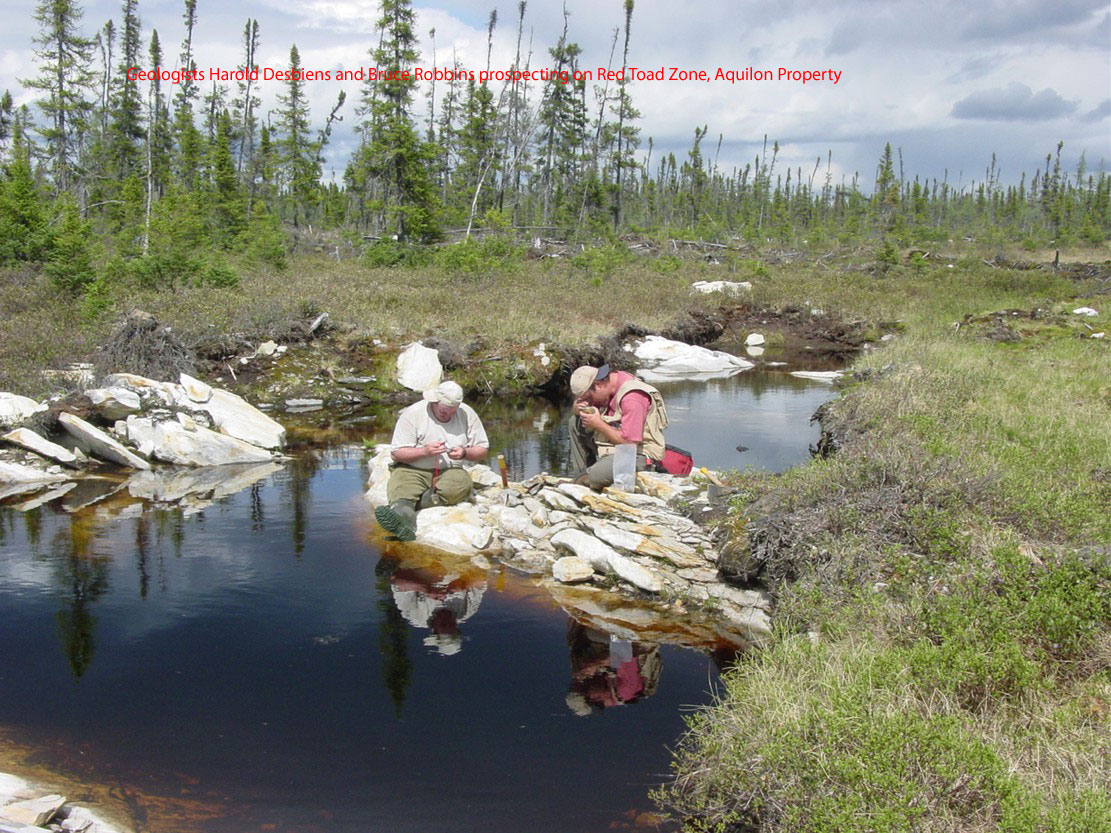 WORK COMPLETED BY GOLDEN TAG (2004-2005):In July 2004, Golden Tag completed an initial evaluation of the Aquilon Property. The purpose of this program was to review the geological setting of known auriferous zones and more importantly to prospect promising new exploration targets. Several grab samples were taken over historical showings and returned assays of>100 g/t Au, which extend the previously known mineralization trends within these areas. Prospecting to the east of these showings resulted in the discovery of a new gold showing � the Red Toad Showing- which returned significant assays in two grab samples, 1691 g/t Au and 153 g/t Au. (refer to Golden Tag�s news release of July 29, 2004 for a synopsis of significant results)