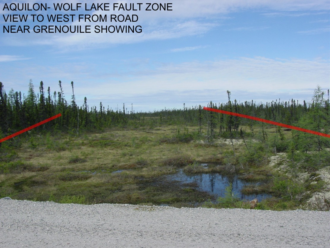 Previous work completed by Sirios Resources Inc and SOQUEM (1997-2002) has outlined numerous relatively short, shallow-dipping high grade (>20g/t Au) quartz veins over the 4km x 400 meter NE-oriented Wolf Fault. Centimetric to metric quartz veins occur within sericitic schist and at contacts of felsic volcanic units and a quartz-phyric tonalitic intrusive. Some very high gold assays: 287.4 g/t Au over 2.3 meters and 110.2 g/t Au over 3.49 meters have been returned. In the central (Lingo Lake) area of the property, east-west oriented auriferous metric quartz veins exhibit 200-300 meter strike lengths and are less deformed in the vicinity of a small tonalitic intrusion. Spectacular visible gold occurrences were discovered at the Lingo-West vein where ten of thirteen shallow drill holes returned : 35.99 g/t Au over 2.0 m; 77.81 g/t Au over 1.0 m; 13.15 g/t Au over 2.0 m; 3.85 g/t Au over 4.6 m; 6.89 g/t Au over 1.5 m; and 4.23 g/t Au over 1.5 m.